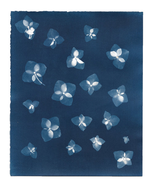 Cyanotypes are camera-less, sun-activated photographs. They are made by coating paper with a light-sensitive solution and exposing it to UV light. An image only becomes permanent once it is fixed (rinsed in water). Until then, it exists in a temporary, light-sensitive state.
